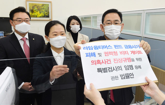 국민의힘 주호영 원내대표(오른쪽)와 국민의당 권은희 원내대표 등이 22일 서울 여의도 국회 의안과에 ‘라임·옵티머스 펀드 금융사기 피해 및 권력형 비리 게이트 의혹사건 진상규명을 위한 특별검사의 임명 등에 관한 법률안’을 제출하고 있다.