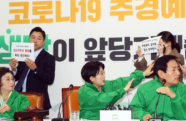 민생당 박주현 공동대표(가운데)가 18일 국회에서 바른미래계 김정화 공동대표가 불참한 가운데 열린 제12차 최고위원회의에서 일부 당직자들이 범여권 비례연합정당 참여에 반대하는 시위를 벌이자 제지하고 있다.