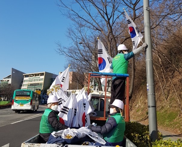 경기 수원시 장안구 영화동 새마을지도자협의회 회원 10여명 27일 3.1절 101주년을 기념해 지역내 도로변에 태극기를 게양하며 ‘나라사랑 태극기 달기 운동’을 전개했다. 사진은 회원들이 태극기를 게양하고 있는 모습.(사진제공=장안구청)