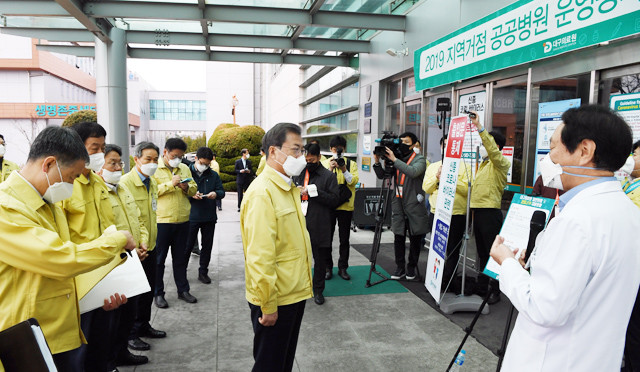 문재인 대통령이 25일 대구의료원에서 유완식 원장의 신종 코로나바이러스 감염증(코로나19) 현황 설명을 듣고 있다.