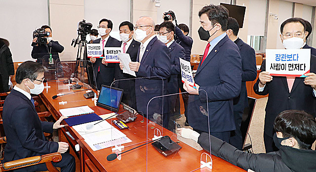 23일 오전 국회에서 열린 변창흠 국토교통부 장관 후보자에 대한 인사청문회에서 국민의힘 의원들이 변 후보자에게 피켓을 들고 항의하고 있다.