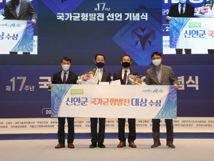 신안군(군수 박우량)은 지난 23일 세종시 문화예술회관 대강당에서 대통령 직속 국가균형발전위원회가 주최한 ‘국가균형발전 선언 제17주년 기념식’행사에서 국가균형발전대상(국가균형발전위원장 표창)을 수상했다고 밝혔다.