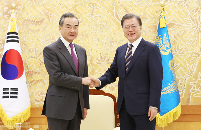 문재인 대통령이 26일 오후 청와대에서 왕이(王毅) 중국 외교담당 국무위원 겸 외교부장을 만나 악수하고 있다.