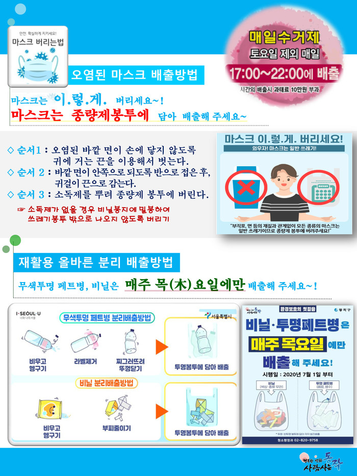 아울러 구는 코로나19 상황으로 인해 주민의 마스크 폐기물 발생량이 증가함에 따라 오염된 마스크를 통한 2차 감염 방지를 위해 ‘오염된 마스크 올바른 분리배출’ 방법을 안내 및 홍보하고 있다.