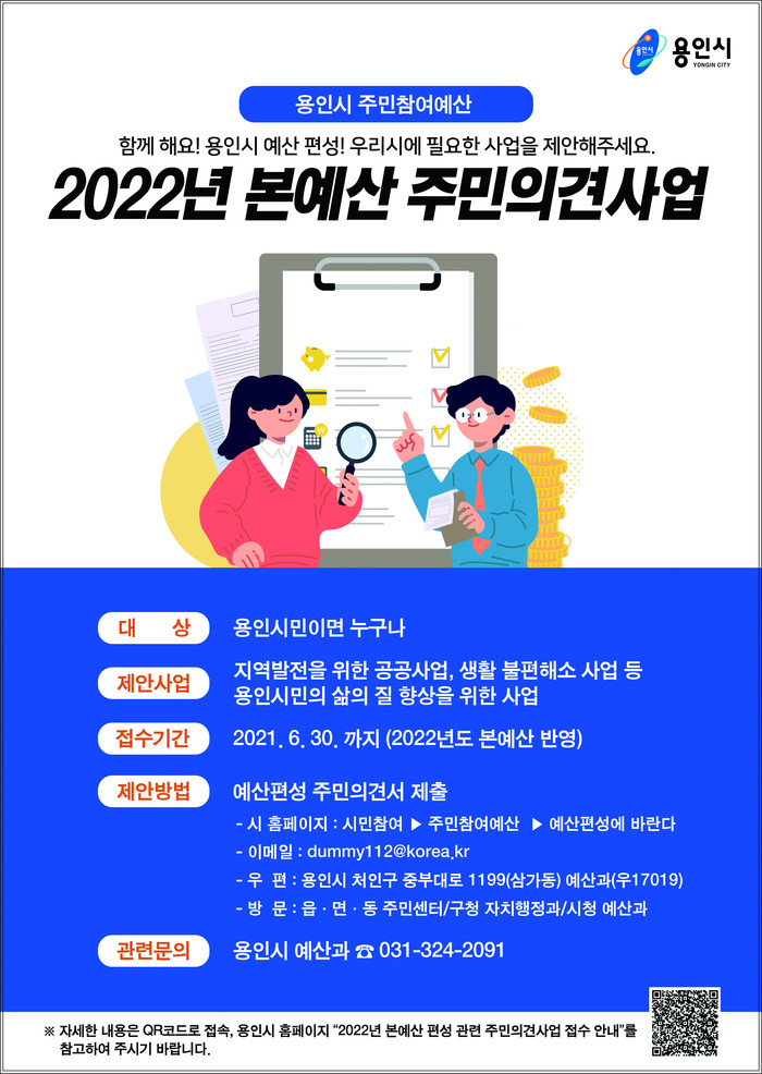 [용인=오왕석 기자] 용인시는 5월1일부터 6월30일까지 예산편성 관련해 시민들에게 설문조사를 실시한다고 밝혔다.