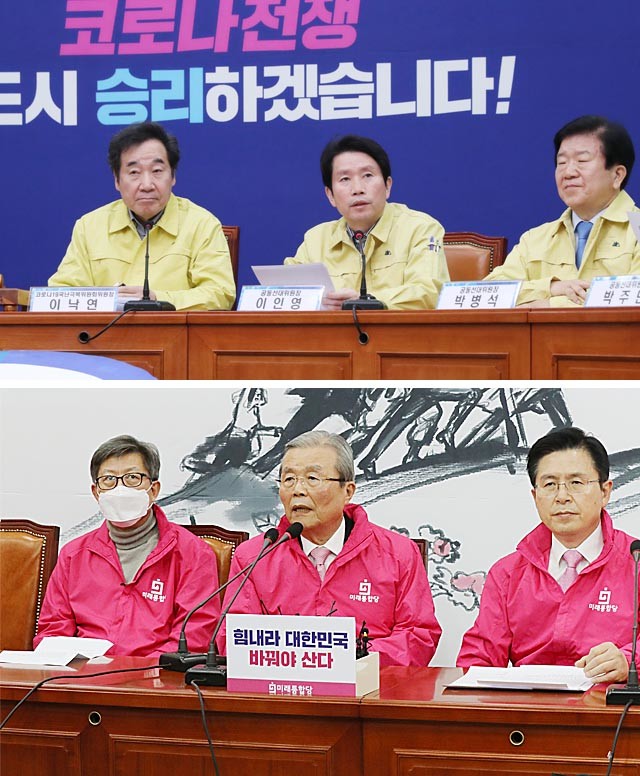 더불어민주당 이인영 원내대표는 30일 미래통합당 황교안 대표가 신종 코로나바이러스 감염증(코로나19)과 관련해 페이스북에 올린 글을 두고 “중대한 시기에 야당 대표가 선거용 거짓선동을 감행하는 건 유감”이라고 비판했다(위). 미래통합당 김종인 총괄선거대책위원장은 30일 국회에서 열린 중앙선거대책위 회의에서 정부의 ‘소득 75% 이하 모든 가구에 최대 100만원 지급’ 방안에 대해 “빚내서 시작하는 것은 다시 생각해봐야 하지 않나 생각한다”며 이같이 밝혔다.