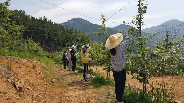 이날 일손돕기에는 내이동행정복지센터 직원 8여명이 참여해 산내면 가인리에 있는 사과 농가에서 사과 적과 작업을 했다.