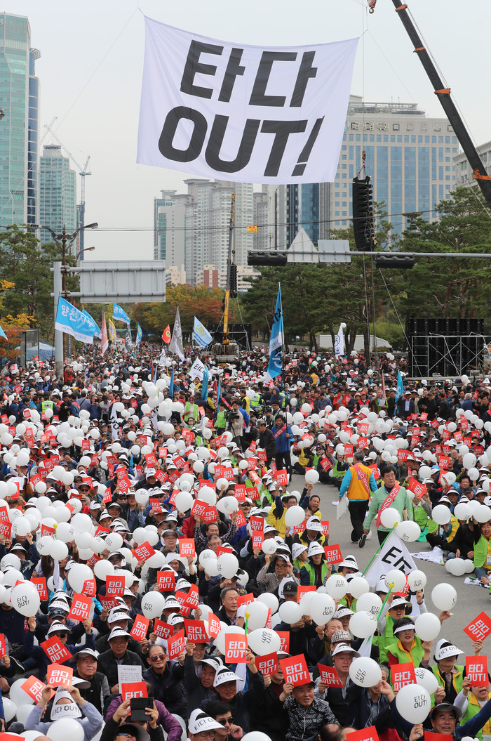23일 오후 서울 여의도 국회 앞에서 열린 '타다 아웃! 상생과 혁신을 위한 택시대동제'에 참가한 서울개인택시운송사업조합 조합원들이 타다 퇴출을 촉구하는 구호를 외치고 있다.