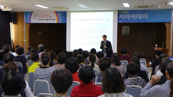 | 희망울림 복지아카데미에 참여한 군민들이 채현탁 교수의 강연을 듣고 있다. |