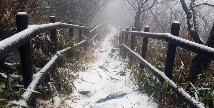 11일 전북 무주군 덕유산국립공원에 올 겨울 들어 첫 눈이 내려 산책로에 쌓여 있다.