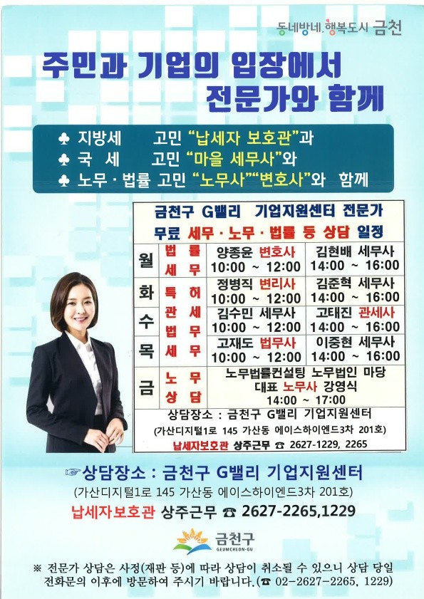 기존 지방세 및 국세 상담은 금천구 마을세무사 4명과 납세자보호관이 맡고, 노무법인 마당 대표 강영식 노무사가 노무상담, 법무법인 정성 대표 양종윤 변호사가 법률상담을 각각 진행한다.