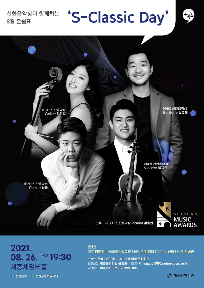 신한은행과 세종문화회관은 진옥동 은행장의 제안으로 지난 6월 문화예술후원 업무협약을 맺고 매년 여름 신한음악상을 통해 배출된 전도유망한 클래식 연주자들의 연주회를 정례화 하기로 했으며 첫 공연으로 오는 26일(목) 오후 7시반 세종문화회관 체임버홀에서 ‘S-Classic Day’를 개최한다.