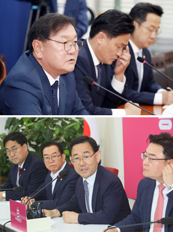 더불어민주당 김태년 원내대표가 29일 국회에서 국회의장과 여야 원내대표단 간 개원 협상이 결렬된 뒤 기자간담회를 열고 있다. 미래통합당 주호영 원내대표도 이날 국회에서 기자간담회를 갖고 협상 결렬에 관해 설명하고 있다.