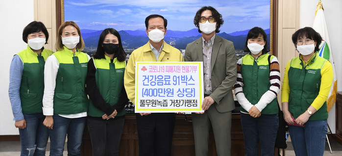 이어서 풀무원녹즙 거창가맹점(점장 임무성)에서도 건강음료 91박스(400만원 상당)를 기탁했고, 임무성 점장은 “코로나19로 인해 심신이 지친 군민들에게 도움이 되고 싶어 이렇게 기부를 하게 됐다”고 소감을 밝혔다.