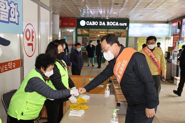 | ▲ 명현관 해남군수(우측)가 설 명절 연휴 첫 날(11일) 다중 이용 시설인 해남시외버스터미널을 찾아 코로나19 예방을 위해 봉사활동을 하고 있는 자원 봉사자들을 격려하며 현장점검에 나섰다. / 해남군 제공 |