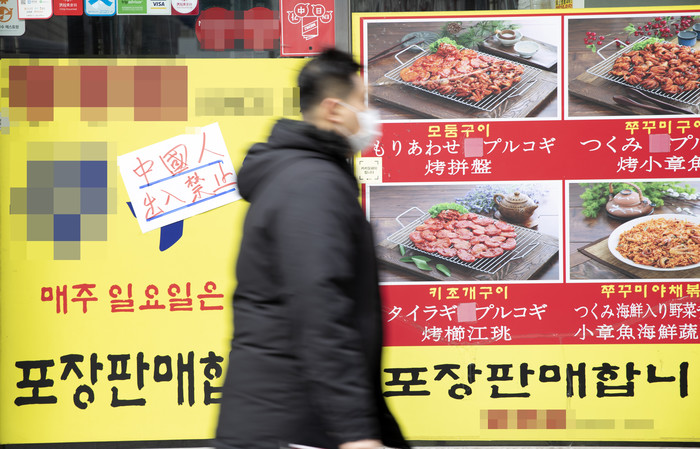 신종 코로나바이러스 감염증 확진자 수가 늘어나고 있는 29일 오전 서울의 한 음식점 입구에 중국인 출입금지 안내문이 붙어 있다.
