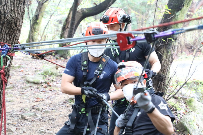 서울 관악소방서는 구조대원의 산악사고 대응능력 향상을 위해 오는 18일까지 관악산 제2광장 옆 계곡에서 산악사고 대비 특별구조훈련을 실시한다. 주요 훈련은 등산객의 추락 등의 산악사고에 초점을 두고 계곡횡단 로프 설치 및 회수 등을 실시한다. 사진은 구조대원들이 특별구조훈련을 하고 있는 모습. (사진제공=관악소방서)