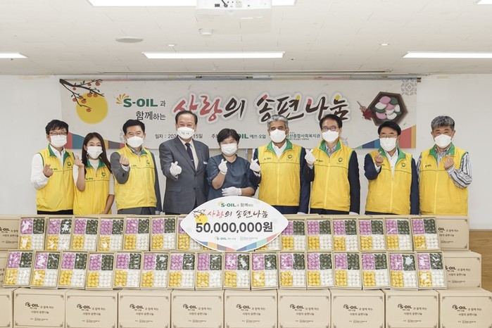 서울 마포구 성산종합사회복지관은 15일 (주)에쓰오일로부터 송편을 비롯한 식료품 및 생필품 꾸러미 박스 910상자(5000만원 상당)를 전달받았다. 꾸러미 박스는 지역내 저소득 가정 910가구에 배부할 예정이다. 사진은 전달식에서 유동균 구청장(왼쪽 네 번째)과 관계자들이 기념촬영을 하고 있는 모습. (사진제공=마포구청)
