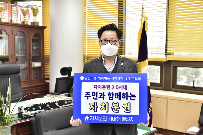 서병완 서울 양천구의회 의장은 지난 22일, 자치분권 2.0 시대의 개막을 응원하기 위해 ‘자치분권 기대해’ 챌린지에 동참했다.