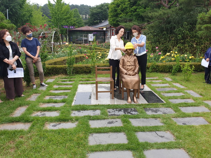 충남 아산시가 지난 18일 소녀상이 건립돼 있는 신정호수공원 광장에서 시청 관계부서 직원과 여성단체 40여명이 참석한 가운데 '평화의 소녀상 건립 4주년 기념행사'를 개최했다. 이날 행사는 주변정리, 소녀상 씻김식, 모자·목도리 입히기, 헌화 및 묵념 등의 순으로 진행됐다. 사진은 소녀상에 모자를 씌우는 모습.