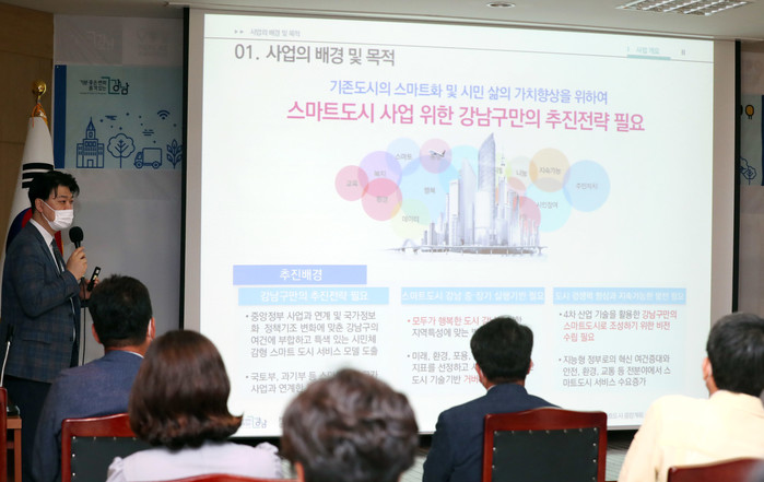 서울 강남구가 6일 오후 지속 가능한 ‘강남구 스마트도시 종합계획 수립’ 관련 중간 보고회를 개최했다. 강남구는 구민 및 공무원 대상으로 지역문제 해결을 위한 의견을 수합해 오는 9월말까지 4차 산업화 시대에 걸맞은 ‘스마트도시 강남’으로의 신성장 동력을 확보할 계획이다. 사진은 ‘강남구 스마트도시 종합계획 수립’ 중간보고회 진행 모습.(사진제공=강남구청)