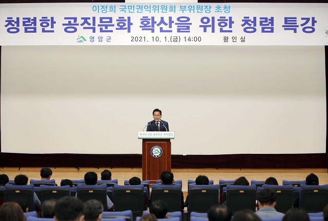[영암=정찬남 기자] 전남 영암군은 1일 이정희 국민권익위원회 부위원장을 초청해 사회적 거리두기 3단계를 준수한 집합교육과 전 직원이 공감할 수 있도록 청내 방송을 통해 청렴한 공직문화 확산을 위한 청렴 특강을 시행했다.