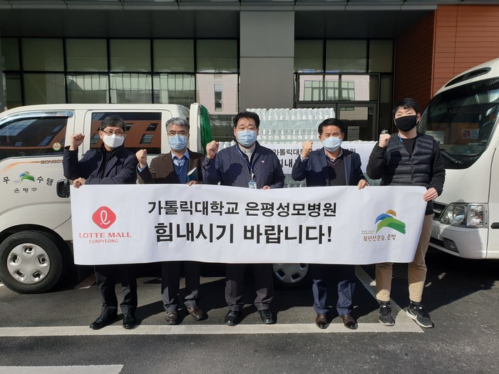최근 서울 은평구 진관동에 위치한 ‘롯데몰 은평점’이 현재 병원내 코로나19 감염 예방을 위해 외래 및 응급실을 잠정 폐쇄한 카톨릭대학교 은평성모병원에 생수(500ml) 5000개를 기부했다. 사진은 생수를 기부한 롯데몰 관계자들이 포즈를 취하며 기념촬영을 하고 있는 모습.(사진제공=은평구청)