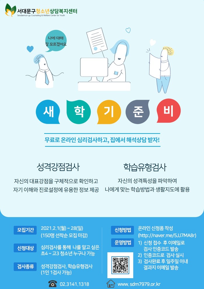 [시민일보 = 홍덕표 기자] 서울 서대문구는 서대문구청소년상담복지센터가 이달 말일까지 2021년 새학기 준비를 위한 온라인 무료 심리검사를 진행한다고 밝혔다.