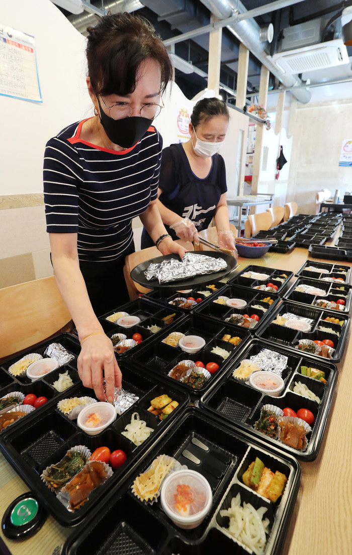 사회적 거리두기 2.5단계가 시행되고 있는 31일 오전 세종시 정부세종청사 인근 식당에서 점심시간에 청사 등지로 배달될 도시락을 만들고 있다.