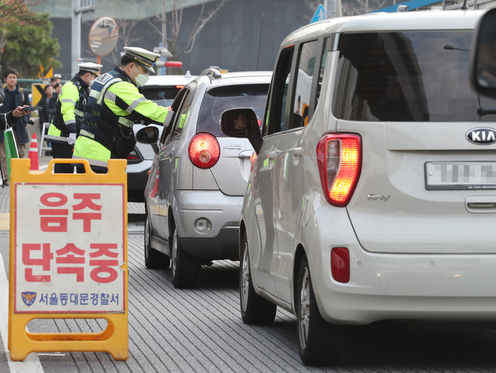 16일 오후 서울 동대문구 용두동 인근에서 경찰이 연말 교통사고를 예방하기 위한 집중음주운전 단속을 하고 있다.