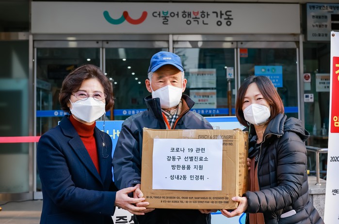 [시민일보 = 이대우 기자] 서울특별시 강동구의회 박희자 행정복지위원장(성내 1·2·3동)이 최근 강동구 보건소를 방문해, 성내동 주민 민경휘씨가 준비한 방한용품을 강동구 선별진료소에 전달하는 뜻깊은 시간을 함께했다.