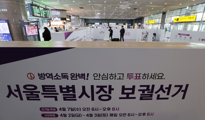4.7 서울시장 보궐선거 사전투표를 사흘 앞둔 30일 용산역 KTX 승강장 입구에서 관계자들이 사전투표소 설치를 하고 있다.