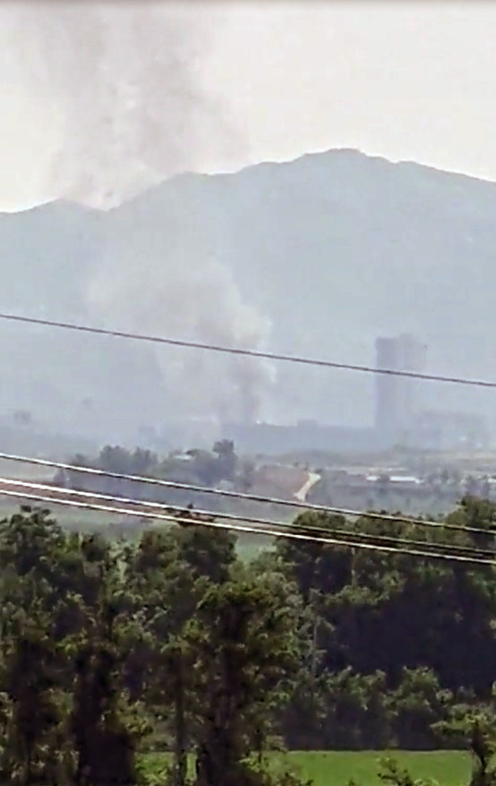 16일 오후 경기도 파주 대성동 자유의 마을에서 바라본 개성공단에서 검은 연기가 피어오르고 있다.