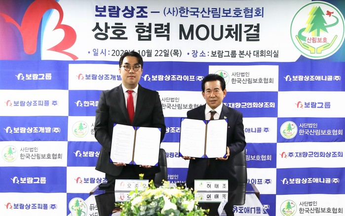 | ▲ 22일 오준오 보람그룹 대표이사(좌)와 허태조 한국산림보호협회 중앙회장(우)이 협약 체결 후 기념 사진을 촬영하고 있다.(사진제공=보람상조) |
