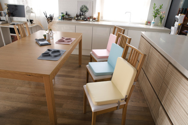 의자에 단단하게 고정할 수 있도록 버클과 찍찍이를 이용해 2중으로 고정할 수 있으며, 식탁에서 어른들과 함께 밥 먹는 눈높이가 맞지 않는 아이들에게 올바른 자세와 식습관에 도움을 줄 수 있는 점이 특징이다.