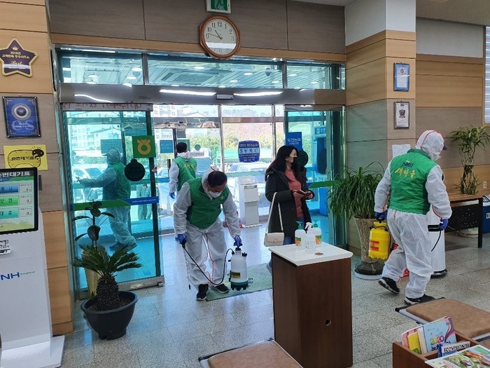 경기 포천시 영중면 새마을지도자협의회, 의용소방대, 자율방재단은 함께 방역봉사단을 구성해 12일 주민이 많이 이용하는 영중교육문화센터, 버스정류장, 농협, 마트 및 각리 마을회관을 대상으로 집중방역을 했다. 사진은 방역작업을 하는 모습.(사진제공=포천시청)