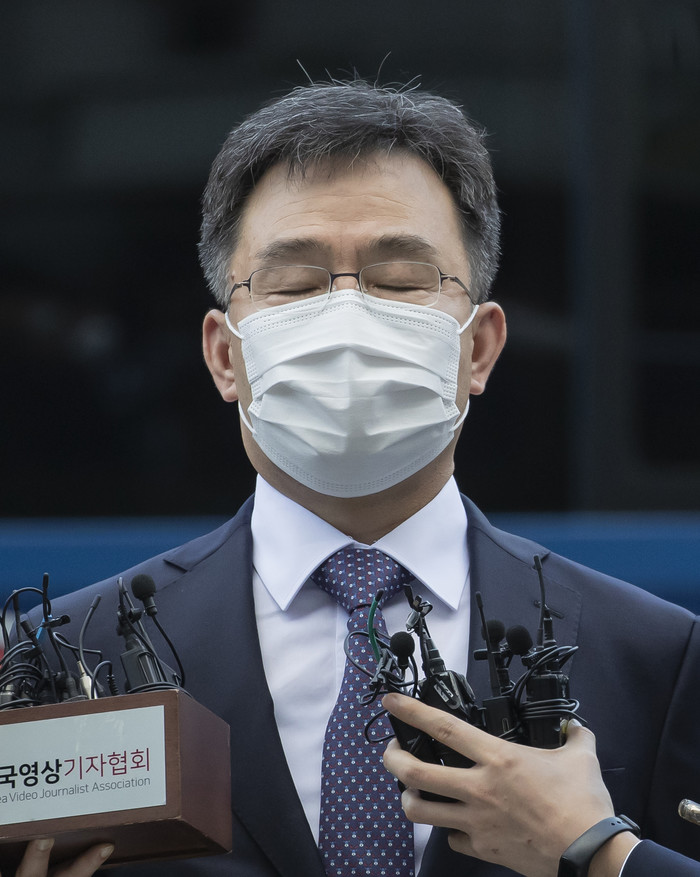 대장동 개발 로비·특혜 의혹의 핵심 인물인 화천대유자산관리(화천대유) 대주주 김만배 씨가 14일 오전 서울 서초구 서울중앙지법에서 영장실질심사를 받기 위해 출석하고 있다.