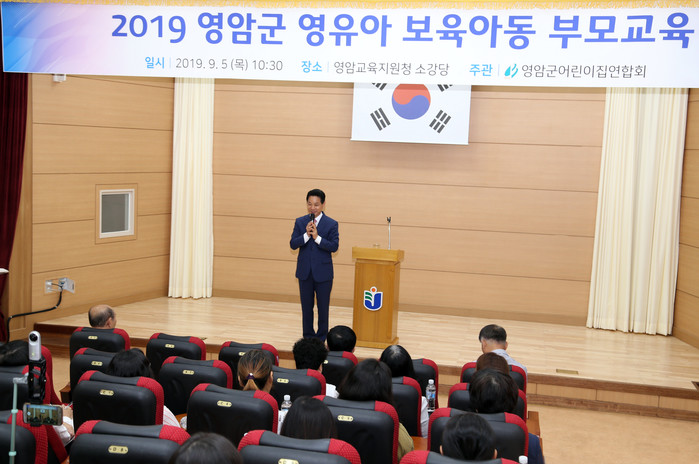 전남 영암군은 최근 영암군교육청 소강당에서 영암군어린이집연합회 주관으로 '2019년 어린이집 부모교육'을 실시했다. 이날 교육에는 지역내 어린이집 이용 아동 학부모 200여명이 참석했다. 사진은 교육에 참석한 전동평 군수가 인사말을 하는 모습.(사진제공=영암군청)