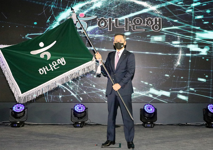 | ▲ 25일 하나은행 을지로 본점 6층 대강당에서 진행된 하나은행장 이취임식에서 박성호 신임 하나은행장이 하나은행을 상징하는 은행기를 흔들고 있다.(사진제공=하나금융그룹) |