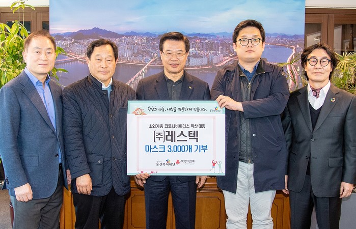 서울 용산복지재단이 27일 (주)레스텍으로부터 코로나19(우한폐렴)로 어려움을 겪고 있는 지역내 취약계층을 위한 방역마스크 3000장(1500만원 상당)을 전달받았다. 사진은 이날 전달식에 참석한 성장현 구청장(가운데)과 관계자들의 기념촬영 모습. (사진제공=용산구청)