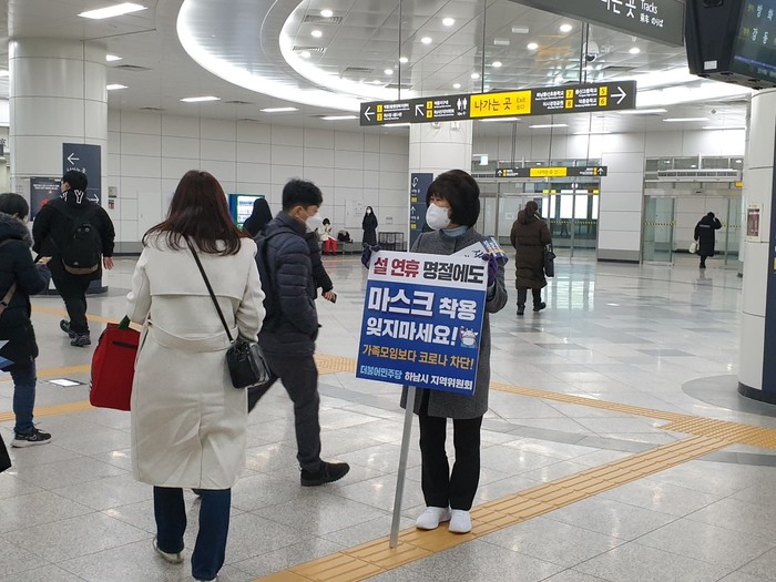 더불어민주당 하남시 지역위원회가 주관한‘설 연휴 특별방역 캠페인’에 참여한 방미숙 의장은 최근 지하철 5호선 풍산역에서 어깨띠를 두르고 피켓을 활용해 캠페인을 실시했다.