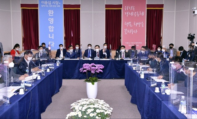 이 시장은 비즈니스센터 내 기업주치의센터를 둘러보고 중소기업인, 소상공인 등 30여 명이 참석한 가운데 기업·소상공인 지원방안을 주제로 현장 대화를 진행했다.