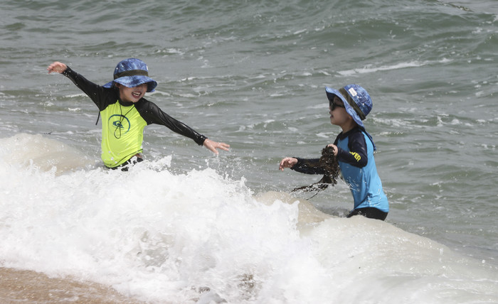 1일 오후 안전관리 요원을 배치해 안전개장을 한 부산 해운대해수욕장에서 어린이들이 물놀이를 즐기고 있다. 올해 코로나19로 6월 조기 개장을 포기한 부산 해운대·송정 해수욕장은 찾아오는 피서객의 물놀이 안전을 확보하기 위해 안전관리 요원을 배치하는 안전개장을 이날부터 실시한다.