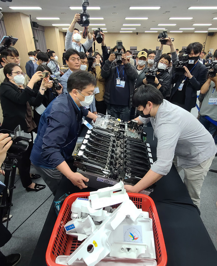 28일 경기도 과천 중앙선거관리위원회에서 4·15 총선 부정선거 주장에 대한 의혹을 해소하기 위해 관계자들이 사전투표 및 개표 공개 시연을 하고 있다.