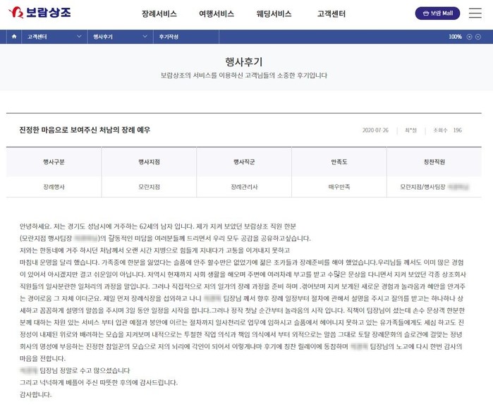 최근 장례를 치르게 된 고객 최*철씨는 “모든 장례 절차를 꼼꼼히 확인하며 이끌어 주시고 문상객과 유가족 모두 세심히 챙겨 주셨다”며 “내적으로는 투철한 직업 의식과 책임 의식으로 외적으로는 토탈 장례문화의 슬로건에 걸 맞는 모습으로 도와주신 노고에 감사의 마음을 전한다”고 후기를 남겼다.