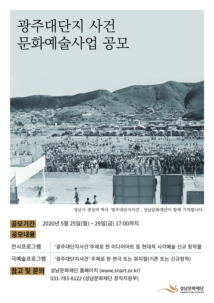 성남문화재단은 이번 공모사업을 통해 잊혀 가는 ‘광주대단지사건’의 역사를 시민들과 함께 기억하고, 공유하며 성남의 정체성을 찾는 계기가 되길 기대하고 있다.