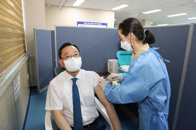 | ▲ 명현관 해남군수가 아스트라제네카 백신을 접종받고 있다. / 사진=해남군 제공 |