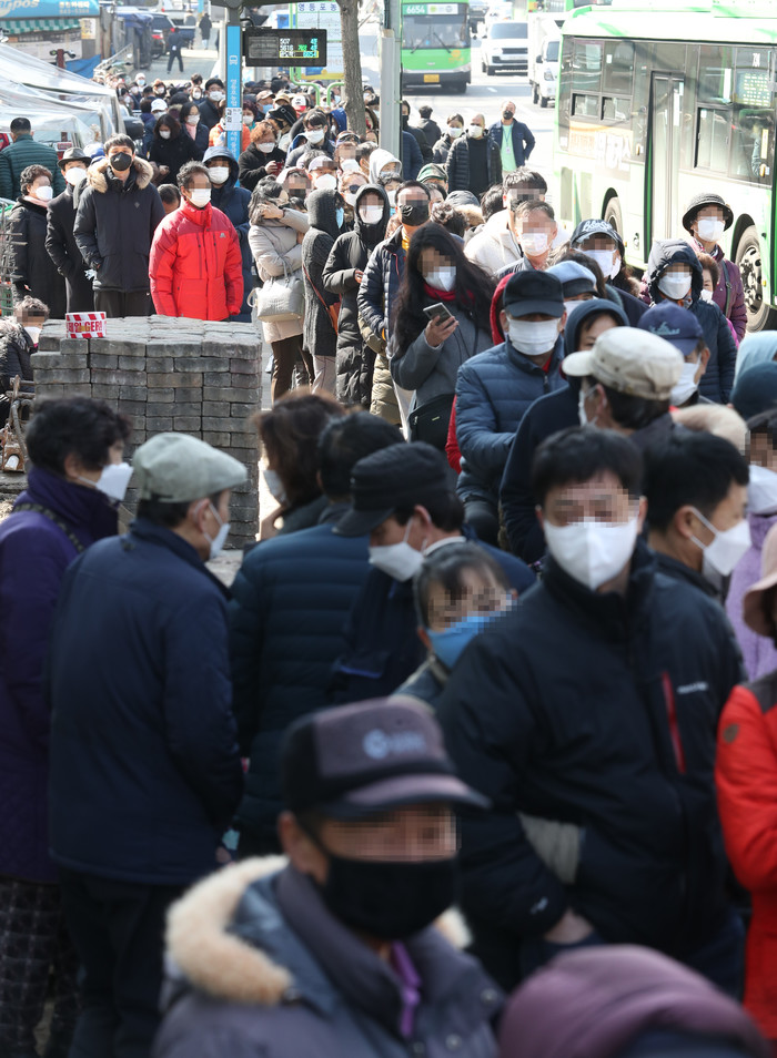 2일 서울 영등포구 하나로마트 영등포농협점에서 마스크를 사려는 시민들이 길게 줄을 서고 있다.