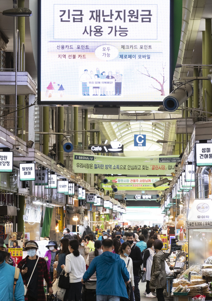 21일 오후 서울 망원시장이 시민들로 붐비고 있다. 이날 전국 소상공인 카드 결제 정보 등을 관리하는 한국신용데이터에 따르면 재난지원금 지급이 시작된 13일이 포함된 5월 둘째 주 전국 소상공인 사업장 평균 매출은 지난해 5월 둘째 주 매출 수준과 같음을 기록했다.