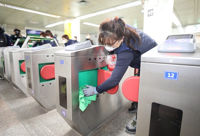 28일 서울교통공사 관계자들이 지하철 5호선 광화문역에서 신종 코로나바이러스 감염증인 '우한 폐렴' 예방 방역작업을 하고 있다.